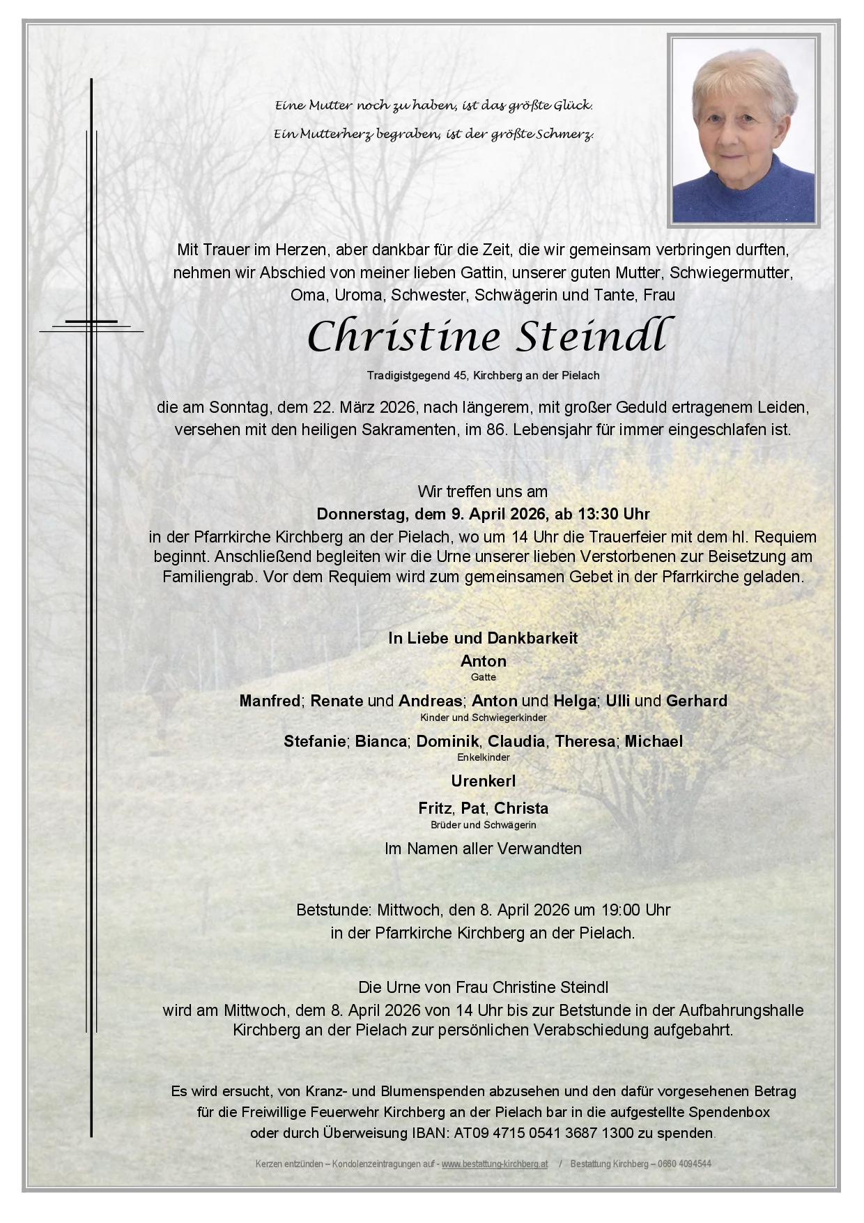 Die Urne mit Frau Christine Steindl wird am Mittwoch, dem 8. April 2026 von 14 Uhr bis zur Betstunde in der Aufbahrungshalle Kirchberg an der Pielach zur persönlichen Verabschiedung aufgebahrt. Betstunde: