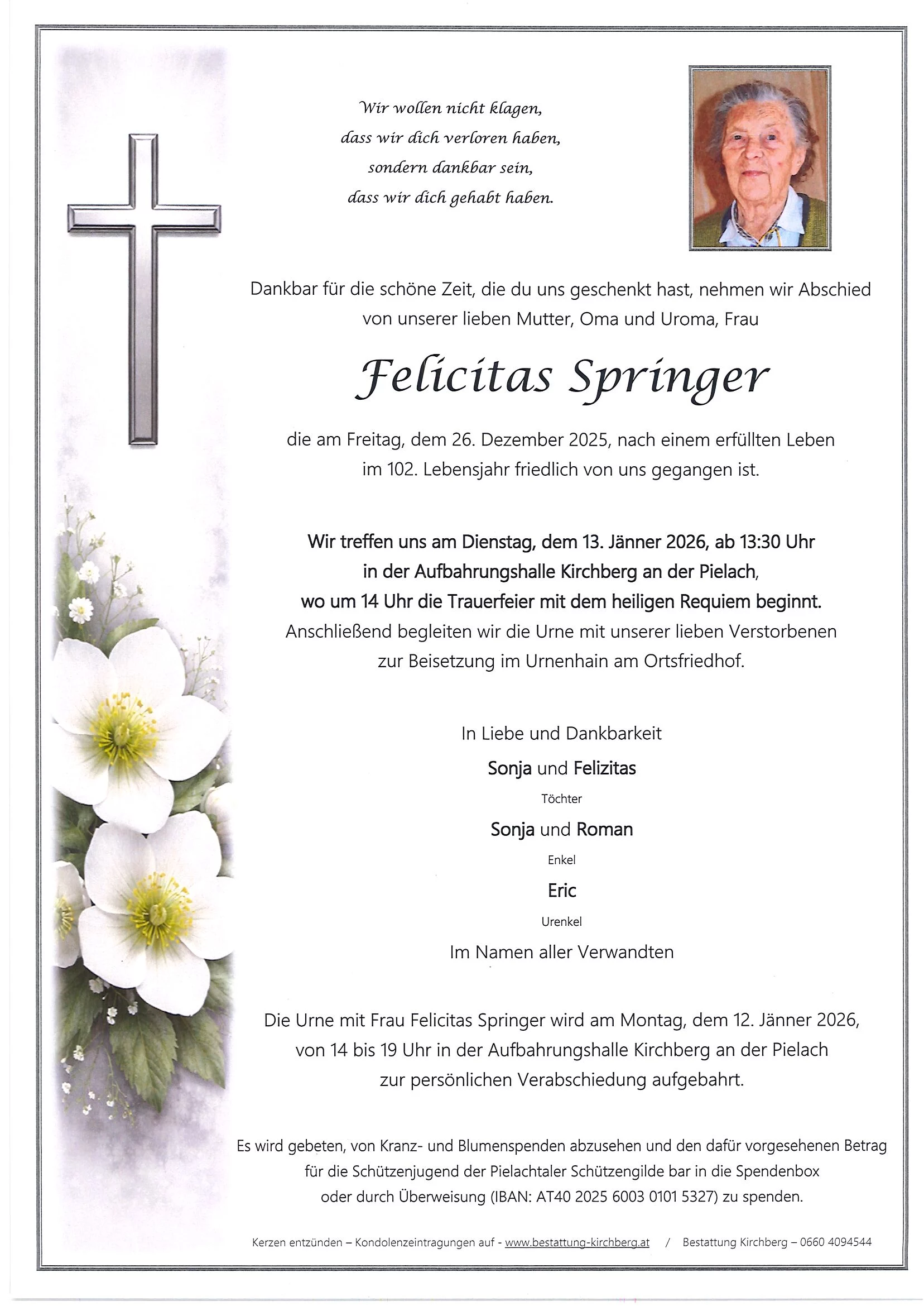 Die Urne mit Frau Felicitas Springer wird am Montag, dem 12. Jänner 2026 von 14 bis 19 Uhr in der Aufbahrungshalle Kirchberg an der Pielach zur persönlichen Verabschiedung aufgebahrt.