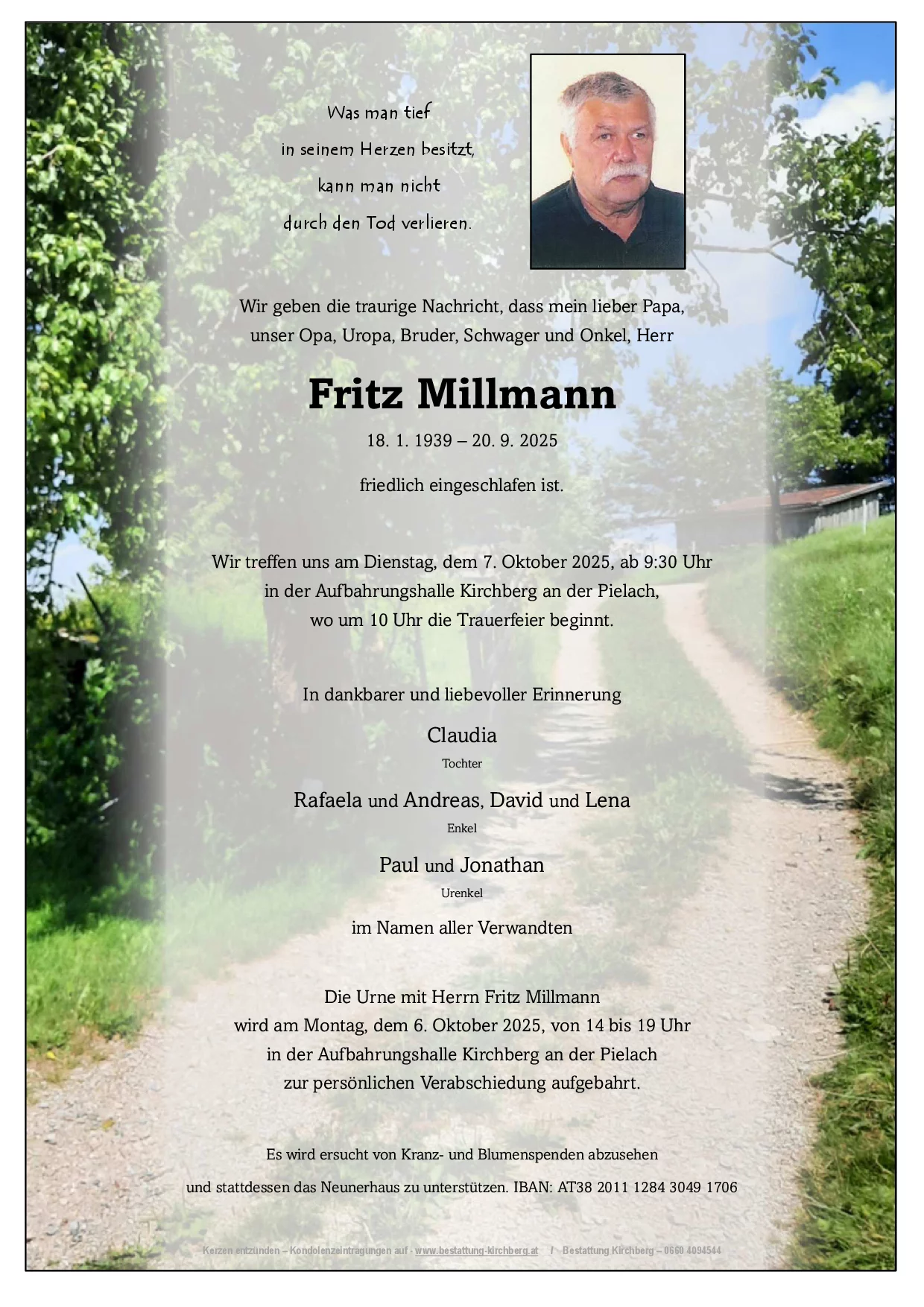 Die Urne mit Herrn Fritz Millamnn wird am Montag, dem 6. Oktober von 14 bis 19 Uhr in der Aufbahrungshalle Kirchberg an der Pielach zur persönlichen Verabschiedung aufgebahrt. Beisetzung: