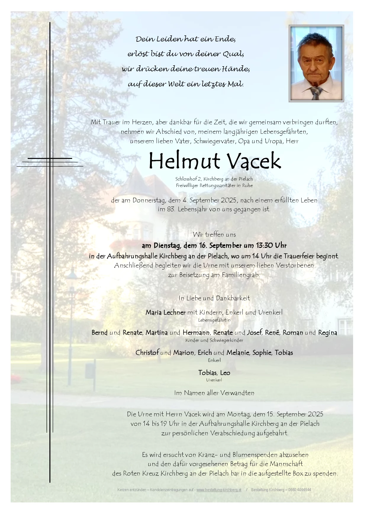 Die Urne von Herrn Helmut Vacek wird am Montag, dem 15. September 2025 von 14 bis 19 Uhr in der Aufbahrungshalle Kirchberg an der Pielach zur persönlichen Verabschiedung aufgebahrt. Beisetzung: