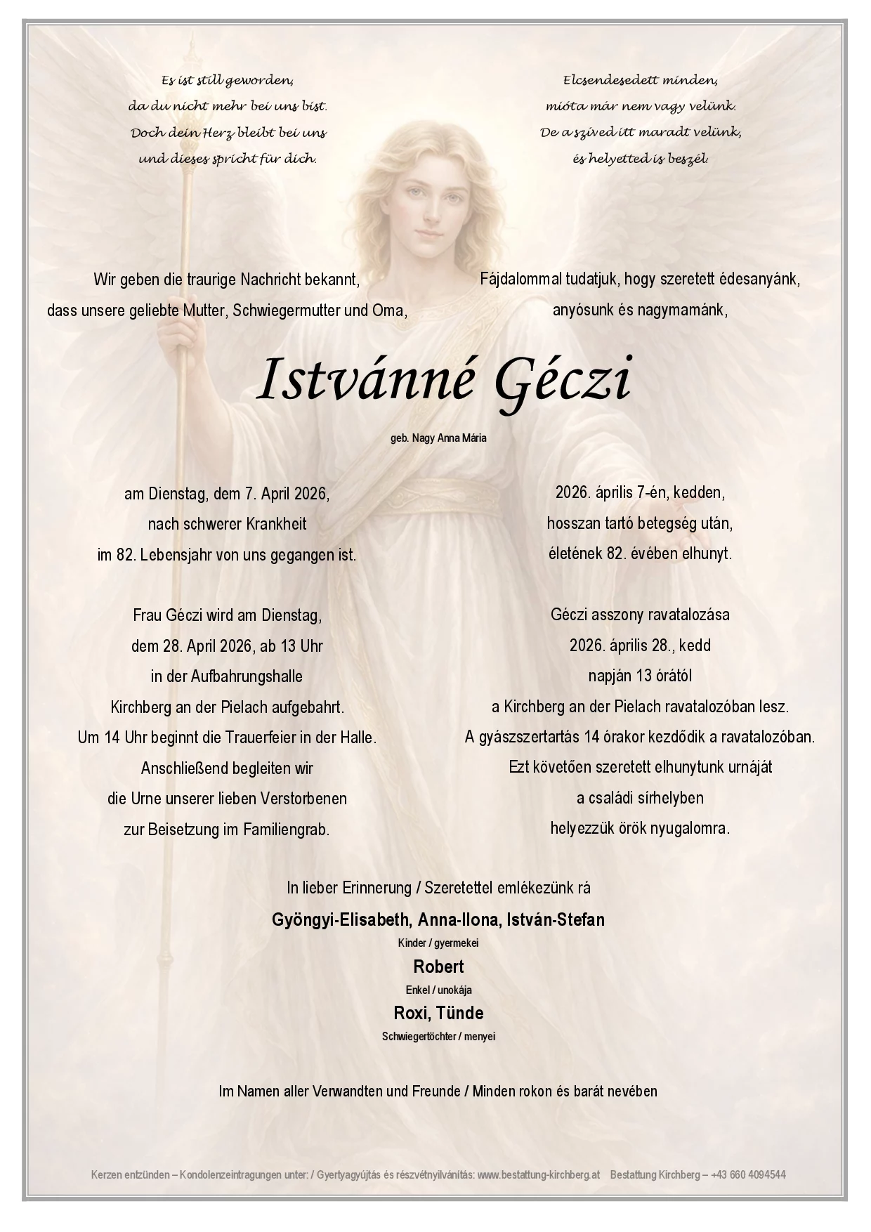 Frau Istvánné Géczi wird am Dienstag, dem 28. April 2026, ab 13 Uhr in der Aufbahrungshalle Kirchberg an der Pielach aufgebahrt. Um 14 Uhr beginnt die Trauerfeier in der Halle. Anschließend begleiten wir die Urne mit unserer lieben Verstorbenen zur Beisetzung im Familiengrab.