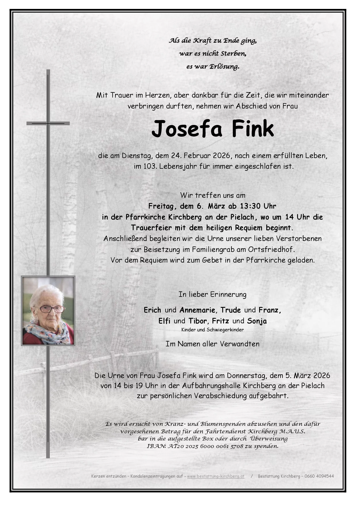 Die Urne mit Frau Josefa Fink wird am Donnerstag, dem 5. März 2026 von 14 bis 19 Uhr in der Aufbahrungshalle Kirchberg an der Pielach zur persönlichen Verabschiedung aufgebahrt. Urnenbeerdigung: