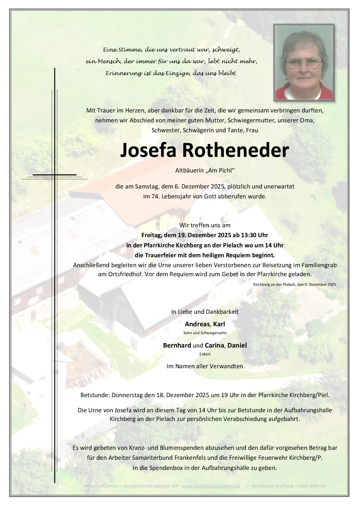 Die Urne mit Frau Josefa Rotheneder wird am Donnerstag, dem 18. Dezember 2025 von 14 Uhr bis zur Betstunde in der Aufbahrungshalle Kirchberg an der Pielach zur persönlichen Verabschiedung aufgebahrt. Betstunde: