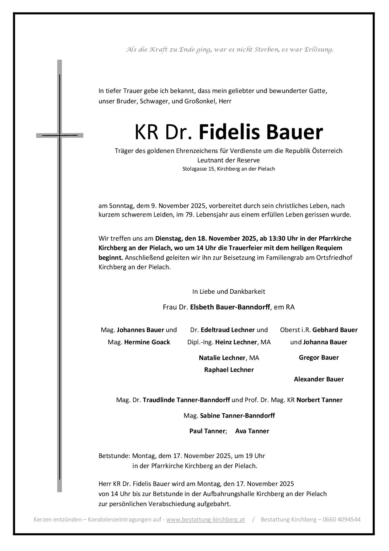 Herr KR Dr. Fidelis Bauer wird am Dienstag, dem 18. November 2025 ab 13 Uhr in der Pfarrkirche Kirchberg an der Pielach aufgebahrt. Vor 14 Uhr wird für Ihn in der Kirche gebetet. Um 14 Uhr beginnt die Trauerfeier mit dem heiligen Requiem. Anschließend begleiten wir unseren lieben Verstorbenen zur Beisetzung im Familiengrab am Ortsfriedhof.