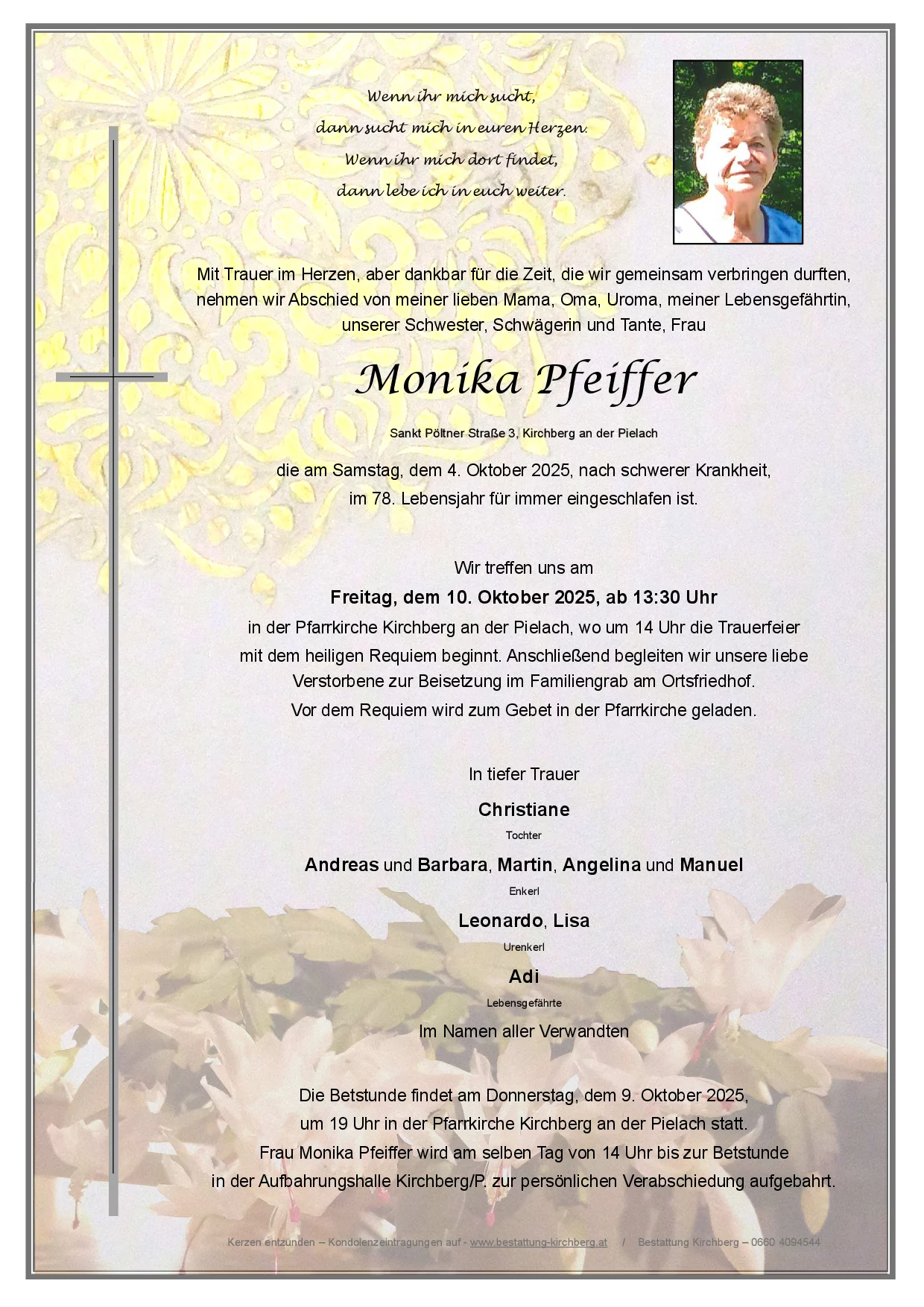 Frau Monika Pfeiffer wird am Donnerstag, dem 9. Oktober 2025 von 14 Uhr bis zur Betstunde in der Aufbahrungshalle Kirchberg an der Pielach zur persönlichen Verabschiedung aufgebahrt. Betstunde: