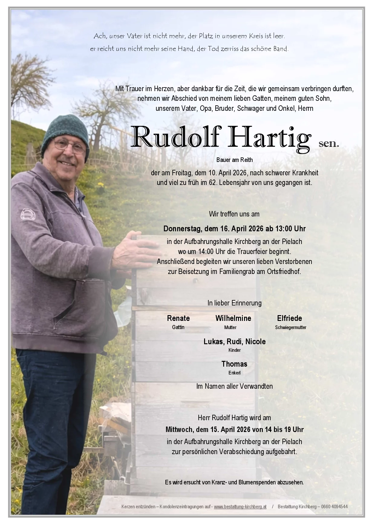 Herr Rudolf Hartig wird am Mittwoch, dem 15. April 2026 von 14 bis 19 Uhr in der Aufbahrungshalle Kirchberg an der Pielach zur persönlichen Verabschiedung aufgebahrt.